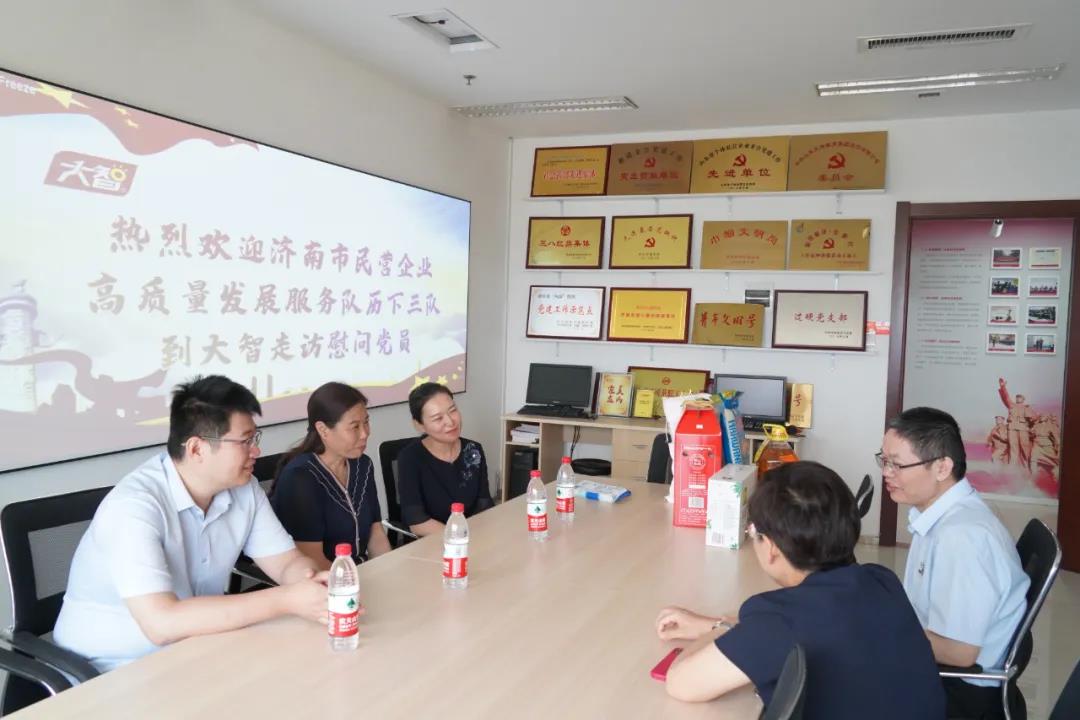 7月1日,濟南市民營企業(yè)高質(zhì)量發(fā)展服務(wù)隊到大智慰問光榮在崗老黨員。大智教育集團黨委書記王現(xiàn)芹熱情接待。