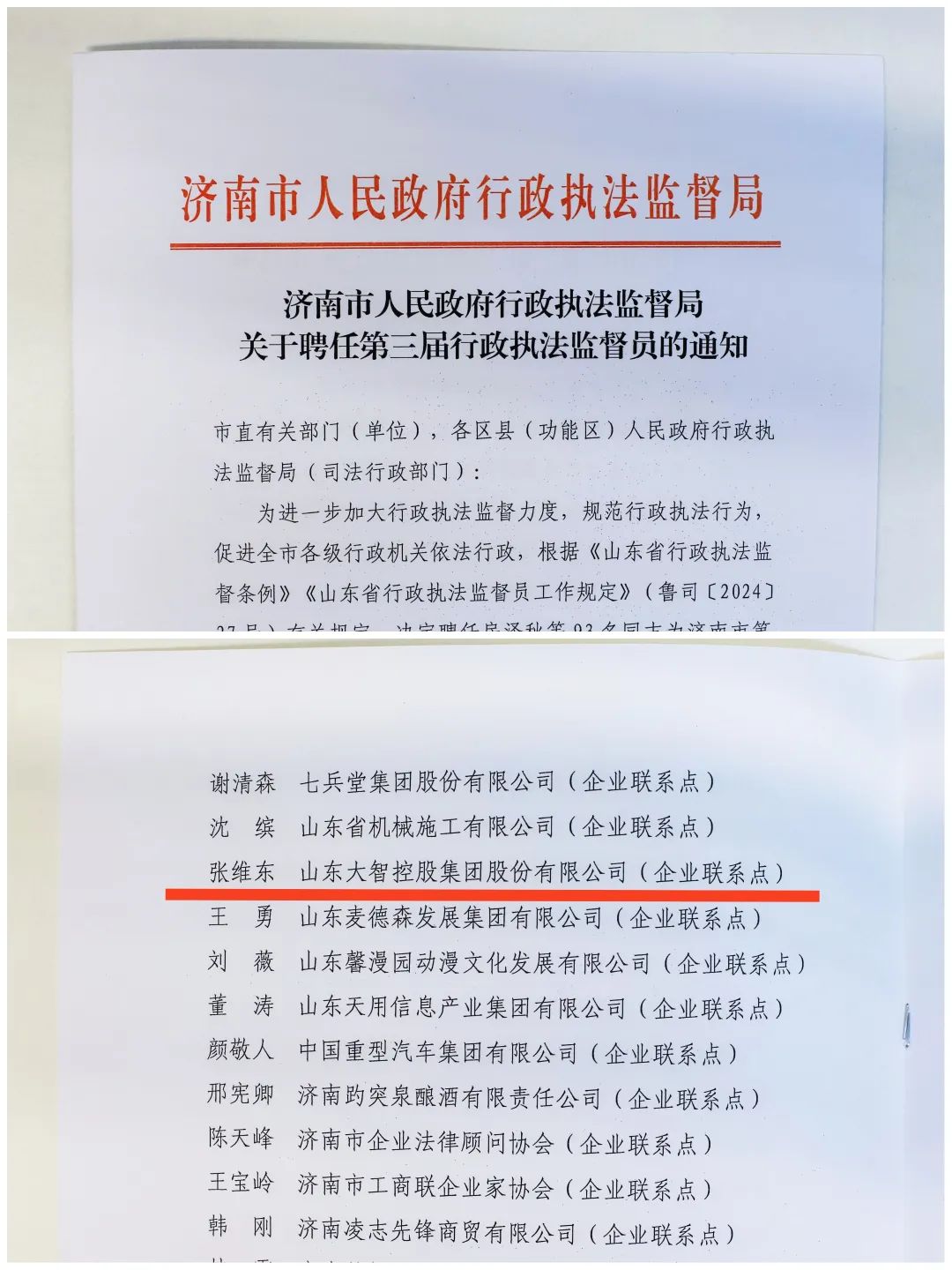 1月15日,濟(jì)南市人民政府行政執(zhí)法監(jiān)督局印發(fā)《關(guān)于聘任第三屆行政執(zhí)法監(jiān)督員的通知》,大智控股集團(tuán)創(chuàng)始人、董事長(zhǎng)張維東被聘為濟(jì)南市行政執(zhí)法監(jiān)督員,聘期三年。