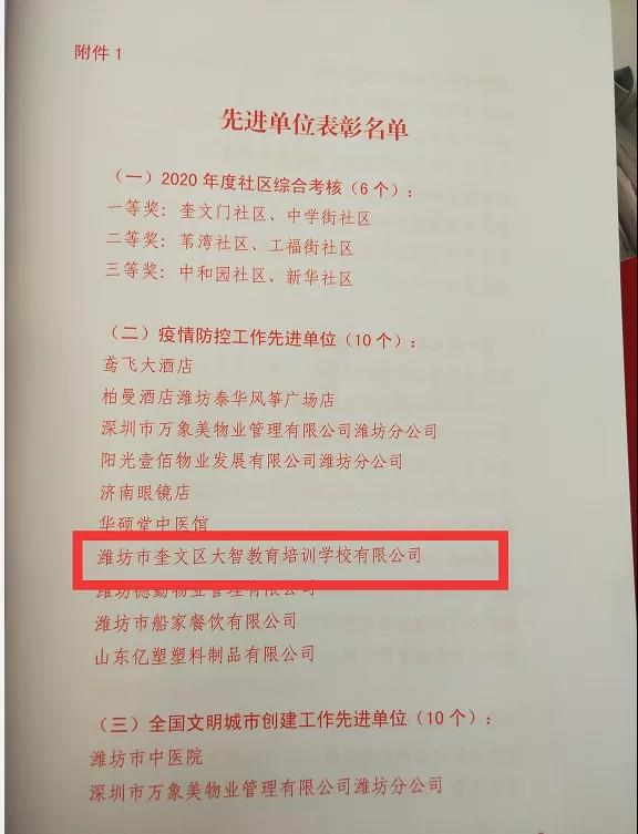 2020年新冠肺炎疫情爆發(fā)以來,大智教育集團(tuán)黨委積極響應(yīng)疫情防控要求,扎實(shí)開展各項(xiàng)疫情防控措施,近日,大智濰坊區(qū)域獲得“疫情防控工作先進(jìn)單位”榮譽(yù)稱號(hào)。