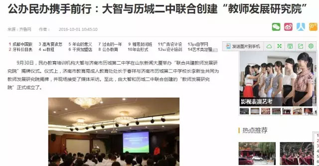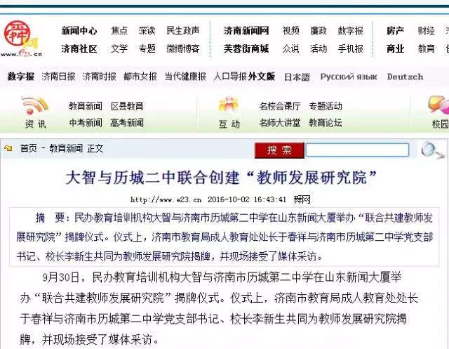 10月01日,《生活日報》08版,發(fā)文指出,大智與歷城二中合建“教師發(fā)展研究院”開創(chuàng)了民辦教育與公辦教育合作新模式,為教育培訓(xùn)機構(gòu)探索出新路子,是教育改革的重大突破。