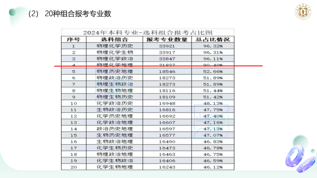 通過分析這個數(shù)據(jù),我們看到,物化加組合可報考的專業(yè)條數(shù)都在 90% 以上,下圖中紅線以上的部分里,我們可以看到相關(guān)結(jié)果。