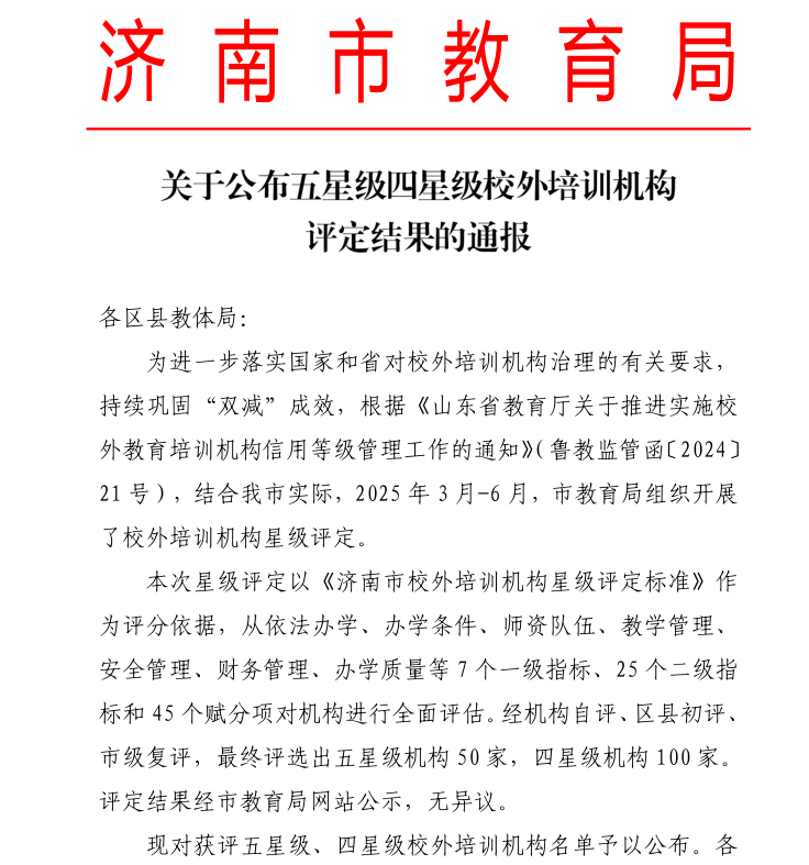 近日,濟南市教育局發(fā)布《關(guān)于公布五星級四星級校外培訓(xùn)機構(gòu)評定結(jié)果的通報》,大智12所分校憑借規(guī)范辦學、優(yōu)質(zhì)服務(wù)和卓越教學成果上榜,彰顯了深耕...