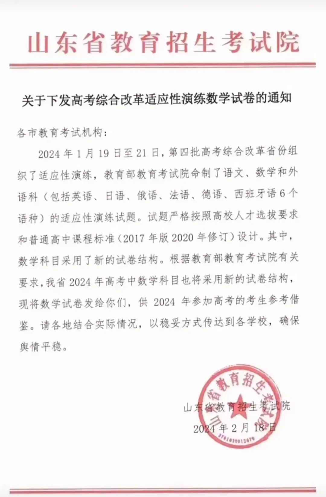 近日,山東省教育招生考試院發(fā)布的《關于下發(fā)高考綜合改革適應性演練數(shù)學試卷的通知》。